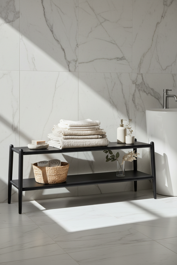 bench with a lower shelf made of oak wood, natural wood, and oak veneer.