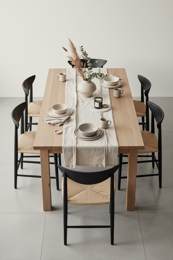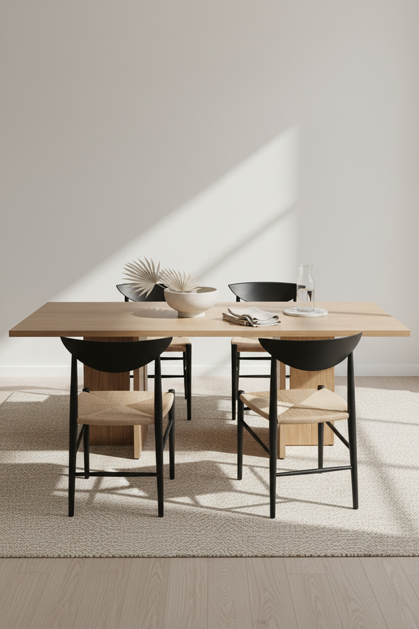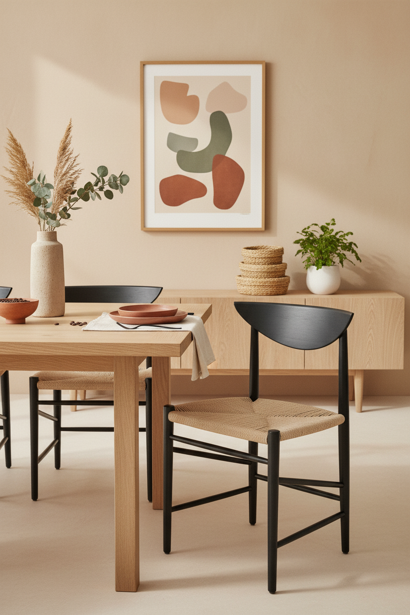 The chair is made from turned solid wood with a formpressed backrest. The seat is hand-woven from a natural paper cord.