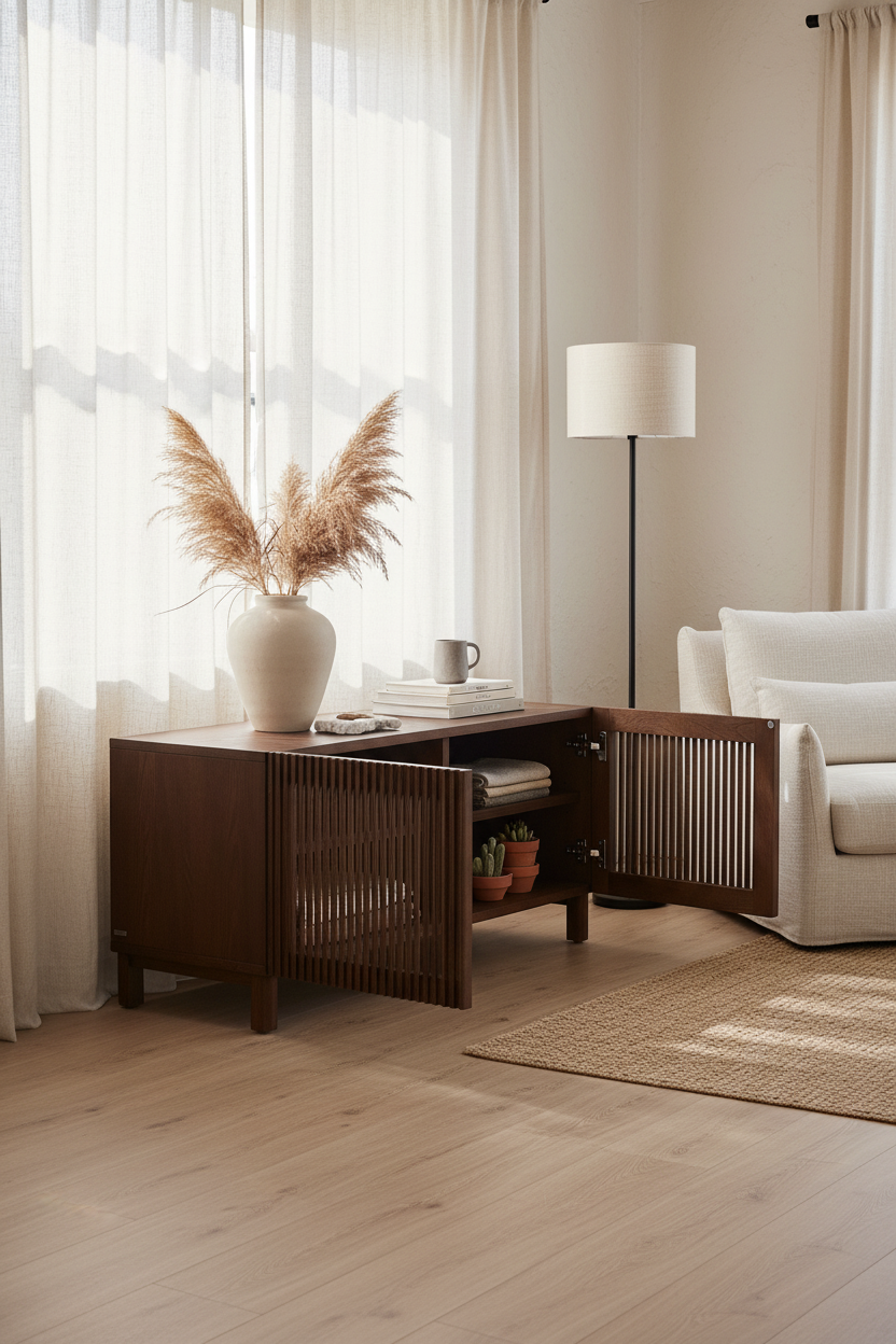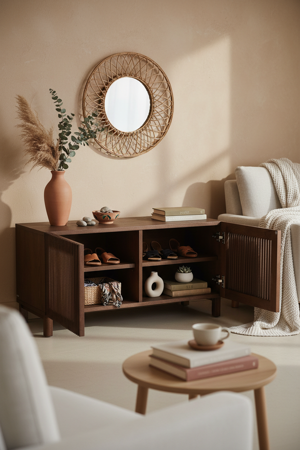 The shoe rack from the Kira collection combines the natural essence of oak wood with a design that has been meticulously curated.