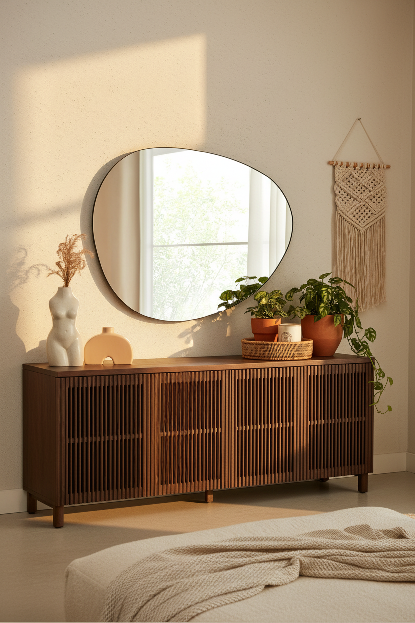 PEBBLE Mirror spells out an aesthetic piece that has been formed from MDF wood and glass and features an irregularly shaped frame.
